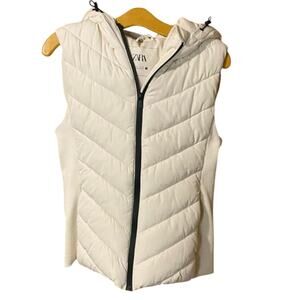 This Zara vest features a sleek white design with a chevron quilting pattern, offering a modern and stylish look. Ideal for layering, its sleeveless construction and full-length zipper make it a versatile addition to your wardrobe. The vest's slight sheen adds a touch of elegance, perfect for cooler weather.