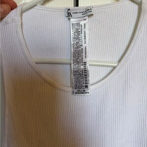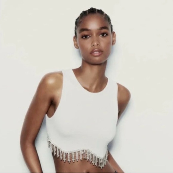 Zara White Ribbed Crop Tank with Rhinestone Fringe
