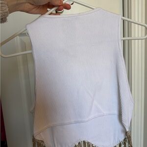 Sleeveless ribbed crop tank featuring a sparkly jeweled fringe hem. Size medium/ large. Has some discoloration I think because of the jacket I wore over it. I’ve never washed it but I think it would come out