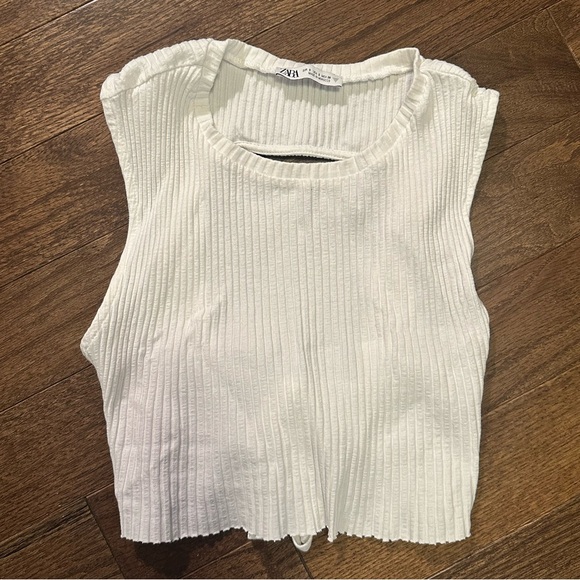 Stylish white ribbed crop top. Sleeveless design. Perfect for any occasion.