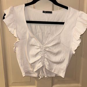 Zara white ruffle sleeves tank top with cute ruching. It includes ties to scrunch and customize the length to be shorter or longer. Very cute and comfortable ribbed material! Size large but could fit medium and even small