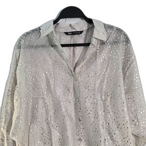 Zara White Semi Sheer Silver Metallic Sparkle Long Slv Button Up Collar Shirt M