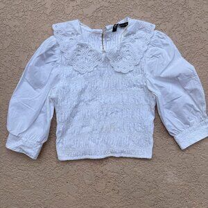 Zara White Smocked Top With Lace -Trimmed Collar Puff Sleeve
