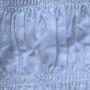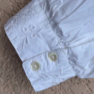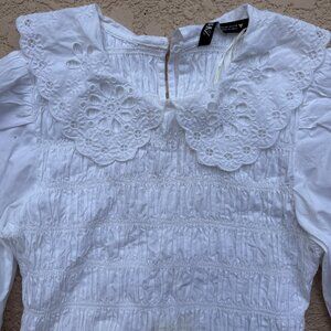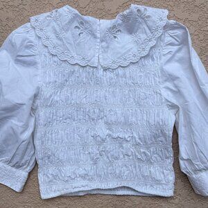 White blouse with smocked details , lace- trimmed collar puff sleeve with embroidery at end of each sleeve, button closure in back, great condition, cute top,