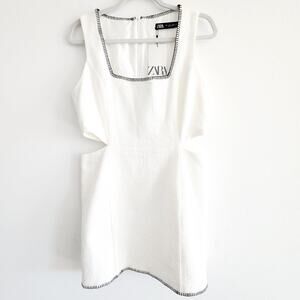 Zara White Tweed Cut Out Mini Dress with Contrast Stitching Cotton Blend Size Large