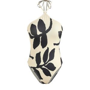 Stylish halter neck bodysuit. Features bold black print on white. Perfect for chic looks.