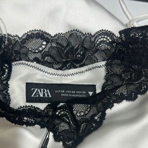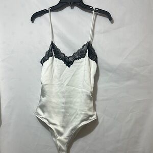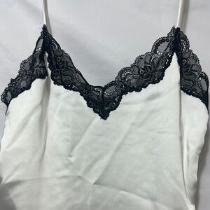Elegant white bodysuit with black lace trim. Spaghetti straps. Perfect for layering or sleepwear.