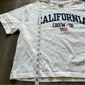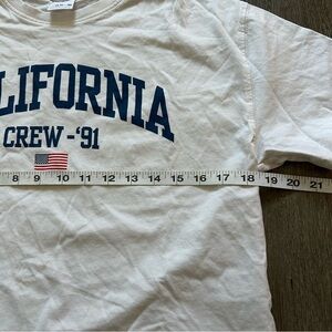 Stylish white tee with bold blue graphic print. Comfortable and trendy design. With American flag. Perfect for 4th of July or a casual summer day!