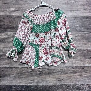 This stylish top features a relaxed fit with a smocked neckline and elegant 3/4 bell sleeves. The design showcases a vibrant white and green pattern, perfect for adding a touch of femininity to your outfit. Ideal for casual outings, this blouse combines comfort with chic style.