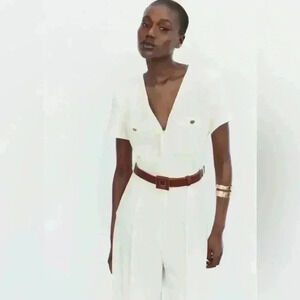 V-neck jumpsuit with short sleeves. Front patch pockets. Straight leg. Front hidden in-seam zip closure and belt.