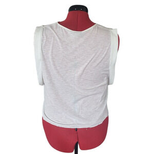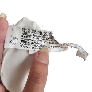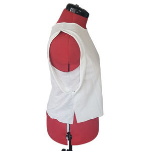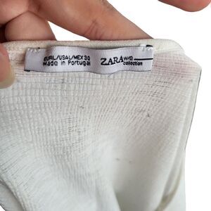 This Zara tank top is a must-have for any casual occasion. The sleeveless top has a round neckline and a pullover closure, making it easy to wear. The white color and solid pattern give it a basic style, while the embellished sleeves and raw hem add a touch of uniqueness. Made of lightweight polyester and elastane material, it is perfect for the summer and spring seasons. This tank top is available in size large and is a regular fit for women.