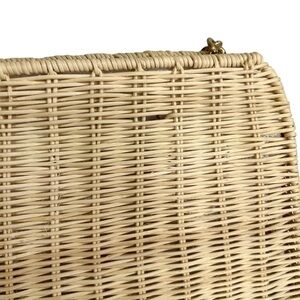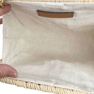 Zara Wicker Woven Basket Gold Chain Handbag Purse. In good preowned condition: there are some gaps to the wicker (some caused during manufacturing) and light wear to the thick gold chain. Structured and sturdy. Faux leather “feet” on the bottom, however it only stands up when opened (will roll over if not opened). Ivory gauzy fabric lining. Strong hidden magnetic closure.