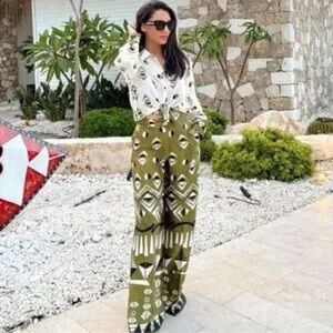 Stylish green pants with unique geometric pattern. Features a zip closure.