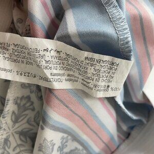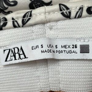 Zara women's wide leg cropped pants with sporty stripes on the sides and tile-like pattern all over. Elastic waistband. Flowy polyester fabric. White, black, blue, red, and pink. Condition: Gently preloved, no holes or stains. Size: Small. See approximate measurements for best fit. Across waist: 12.5" flat to 14"+ stretched Front rise: 12" Back rise: 16" Inseam: 24.5" Across leg opening: 14" Cleaned and from a smoke-free home. Fast shipper!