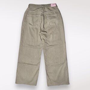 Zara wide-leg jeans in a muted green denim with raw hems. Relaxed fit, 100% cotton with a high-rise waist. Altered for a slimmer fit; see measurements for exact sizing.