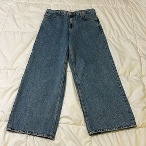 Zara wide-leg jeans. 100% cotton denim in a medium wash, relaxed baggy fit. 28.5 inch inseam, professionally hemmed by a master tailor. Zip and button closure. On trend!