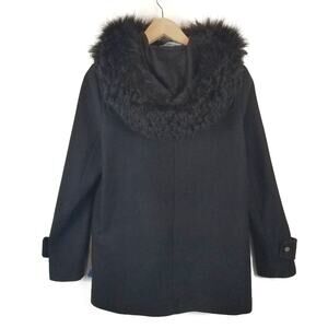 Zara Woman Black Faux Fur Trim Hooded Toggle Button Duffle Coat Size Medium