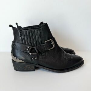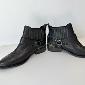 Zara Woman Black Leather Western Boots! Incredible ankle booties with a western feel, these shoes feature a pointed toe, harness buckle strap, white decorative stitching, and silver metal decorative detail on the pointed toe and at the back of the heel. Made for the Spring/Summer collection at Zara. These have been minimally worn, still in great condition. Labeled a size EU 37, which would best fit a women's US 6.5. Most likely retailed between $100-$149. Cannot find another pair just like them anywhere online! Such a cute shoe that can be styles in so many ways!
