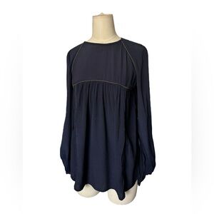 Zara Woman Blouse Navy Blue Gold Trim Peasant Sleeve 100% Viscose Women's Small