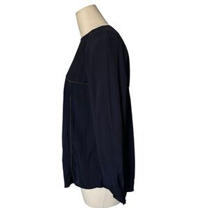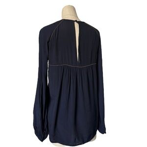 Zara Woman Blouse Navy Blue Gold Trim Peasant Sleeve Women's size Small Condition: Very good, pre-owned. No rips or stains. Additional Details: ◾ Due to lighting, color may vary slightly from photos ◾ Previous washing may change the sizing. Check measurements to ensure fit. ◾ No trades. Reasonable offers welcome! ref053757022