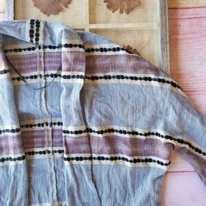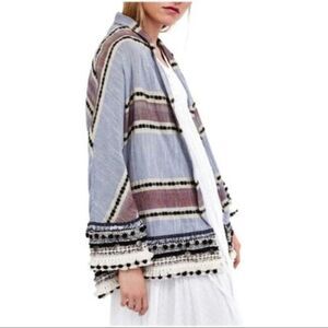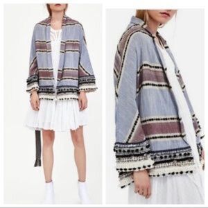 Zara Woman Blue Stripe Woven Embellished Trim Boho Kimono Size Small