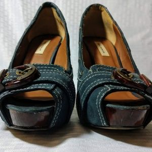 Vintage Zara Woman Blue Suede Pumps. The color is a deep blue that almost looks a bit green in certain light. Heels, front, and buckle are a shiny tortoise shell brown coloring. These are vintage and show some wear. The bottom of the soles are heavily worn (cosmetically, no damage to the shoes) and there are small dings to the front brown parts. Please see photos. The rest of the shoes are in very nice condition. These are very well-made shoes and still look fantastic despite their age.