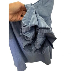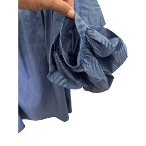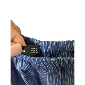 Zara Woman Blue White Pinstriped Ruched Puff Sleeve Off Shoulder Top Size S