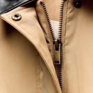 Quilted jacket with matching faux leather lapel collar. Long sleeves with pleated cuffs. Front flap patch pockets. Front hidden zip and snap button closure. taupe brown