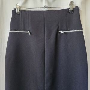This elegant black pencil skirt is perfect for any occasion. Its sleek design offers a sophisticated look. Has a front slit, zipper closure down the back, has silver zipper details, in excellent pre-owed condition.
