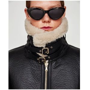 Brand new current season faux leather faux rabbit fur Aviator jacket Zara Woman brand. Not my style so selling. Marked XL but fits more like an oversized M or regular fit L. I am a size 8 with 34DD bus for reference. Fits me comfortably. Not oversized on me. The fur is fake but it feels so soft just like rabbit fur and is actually extremely warm! This jacket is online and in stores at Zara right now and I have never worn it except to model it so you are saving $50 on a brand new jacket.