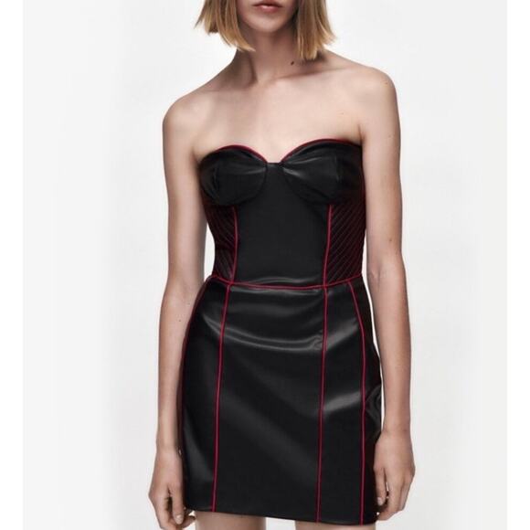 Zara Woman Faux leather Corset Mini dress Black Pink Trim Small Gothic Clubwear
