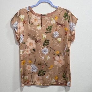 Zara Woman Floral Print Blouse Beige Peach Short Sleeve Top Size S