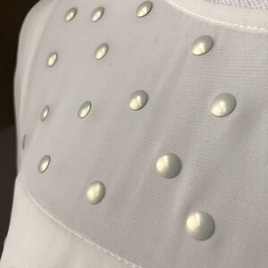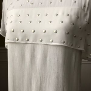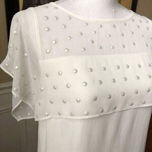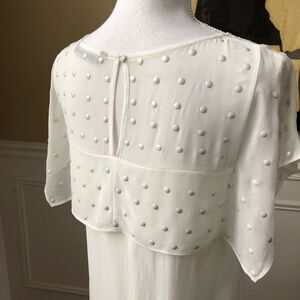 Perfect for brides to be or graduates. Zara Woman white shift dress With sheer weight flutter sleeve overlay with keyhole button back and ivory metal stud dot detail. measurements are approximate and taken while laying flat: 18 inches from armpit to armpit 35 inches from shoulder to hem and approximately 18 inches across the waist