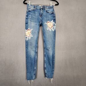 Zara Woman Jeans Womens 2 Blue Skinny Floral Embroidered Distressed Raw Hem