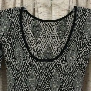 This dress is made out of a thick and high quality fabric. 3/4 sleeves. Fitted at top and flares into a skater style skirt at bottom. Low cut back. Beautiful knit print. This dress can be worn many ways for a casual or dressy look. Pair with leggings and combat boots for a casual look or with heels and a pearl necklace for a dressy look.