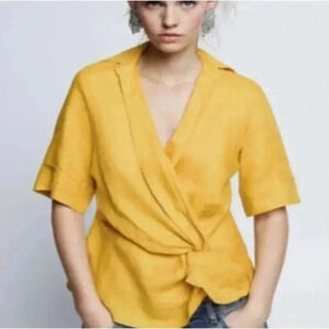 Zara Woman Mustard Yellow Linen Front Twist Faux Wrap Top Casual Blouse Size S