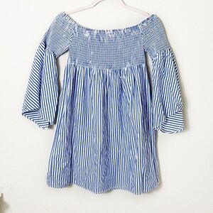 Zara Woman Off Shoulder Shirred Tunic or Mini Dress Coastal Stripe White Blue XS