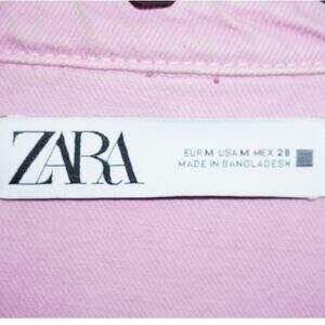 Zara Woman oversized denim jacket in a soft pastel pink color. Features a button-front closure, single chest pocket, and long sleeves with button cuffs. Lightweight and perfect for layering, this casual-chic jacket adds a pop of color to any outfit.