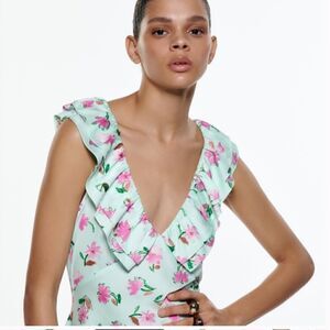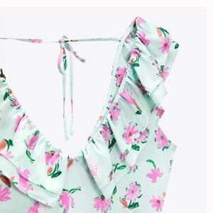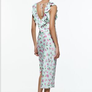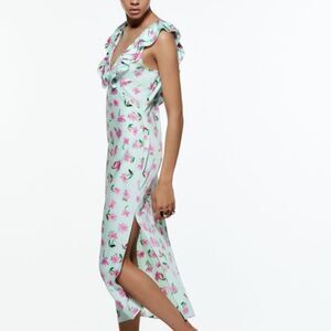 Beautiful Zara floral ruffled slip dress has some major '70s vibes! Pair it with sandals for a cute warm weather outfit, or rock an edgy winter-appropriate look by wearing it with a cropped leather jacket and combat boots.