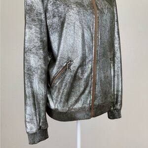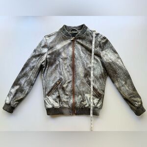 Distressed metallic silver foiled over olive green faux suede style base, bomber jacket from Zara with an olive green satin lining, full zip front, zip pockets, and banded collar and waist. Super fun jacket. Size S. Gently used. First image is not mine but of the same jacket, borrowed from Pinterest for reference.