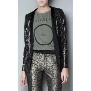 Elevate your wardrobe with this Zara Woman blazer. Its striking sequin design adds sophistication to any ensemble. Tailored for a sleek fit, it's an ideal choice for making a statement at professional events or evening outings.