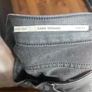 Upgrade your denim collection with these stylish Zara Woman slim fit coated jeans in size 6. Featuring a sleek black coated finish, these jeans offer a modern and edgy look that pairs perfectly with a variety of tops and jackets. These jeans are medium rise and provide a comfortable yet flattering fit.