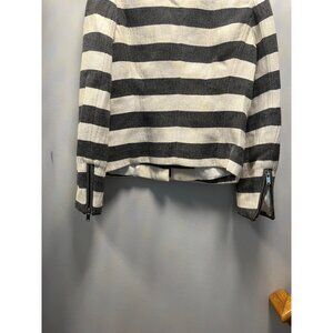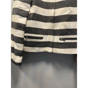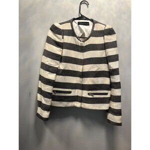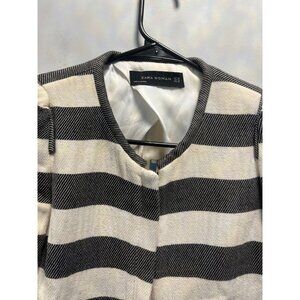 This Zara Woman jacket showcases a classic striped design with a modern twist, featuring sleek zipper accents. It's perfect for layering, offering both style and comfort. The neutral color palette makes it versatile for various outfits. Ideal for those who appreciate a blend of timeless patterns and contemporary detailing.