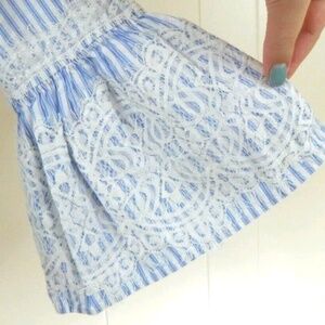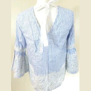 Item: Women's Blue Striped Lace Trim Bell Sleeve Bow Back Top