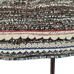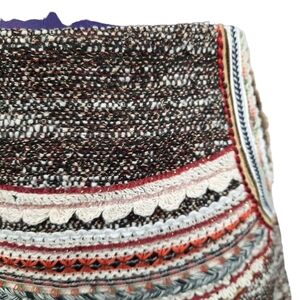 Features embelished bohemian Tweed mini skirt, multicolored of neutral brown hues accented by maroon teal and cream, textured fabric, lined, raw hem, hidden side zipper, bohemian style.