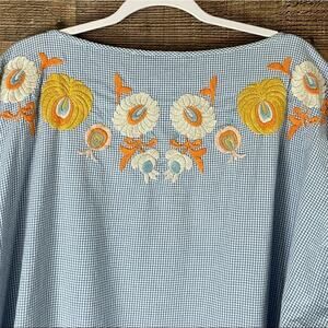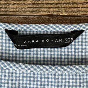 Zara Woman White Blue Gingham Check Print Floral Embroidered Tunic Top SZ Medium
