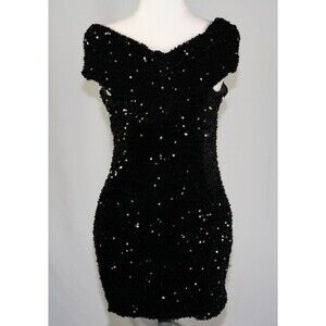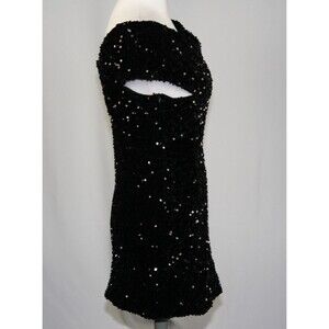 This Zara black sequin dress is in excellent used condition, no stains, tears or holes. It contours the body and is short. The sleeves are slightly off the shoulder and it is short sleeved.
