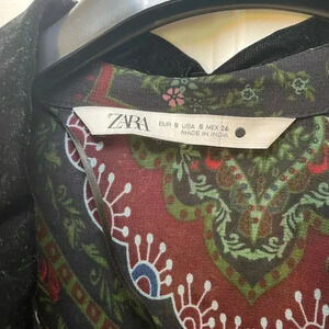 Add a pop of color to your wardrobe with this beautiful black sheer Zara blouse. The intricate paisley pattern and colorful print make this blouse a standout piece. The long sleeves and velvet collared neckline make it perfect for both formal and casual occasions. The button-down closure and flowy fit add a touch of elegance to the blouse, while the velvet collar and sequin accents give it a fun and playful vibe. This blouse is made from high-quality viscose fabric and is sheer, making it a perfect choice for any season.