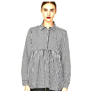 Zara Women premium collection black white gingham tunic top.Botton down soread collar.Bodydoll ruffled waist.High low rounded neck .Long sleeves.Relaxed fit.