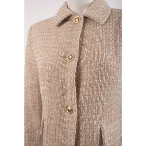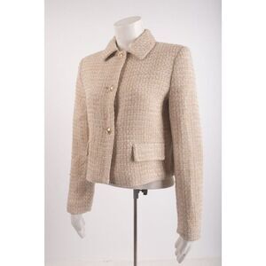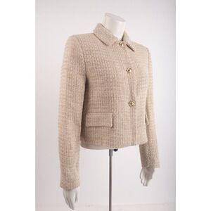 Zara Womans Suit Jacket Blazer Size M Tan White Gold Metallic Check 8491/702. Wool Blend. Metallic gold threads through the checks. Three gold button closure. Collared. Lined. Flap front pockets.